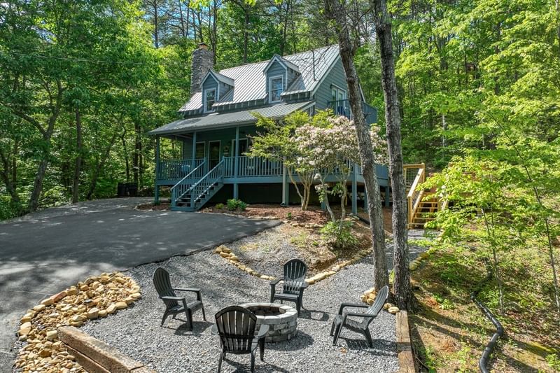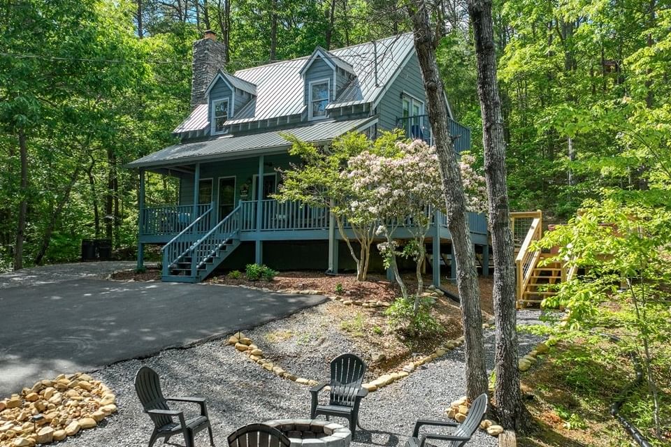 Featuring vaulted ceilings, a wood-burning fireplace, and panoramic views, our four-bedroom cabin includes a covered patio, full kitchen, dining area, laundry facilities, and private bedrooms with full bathrooms.