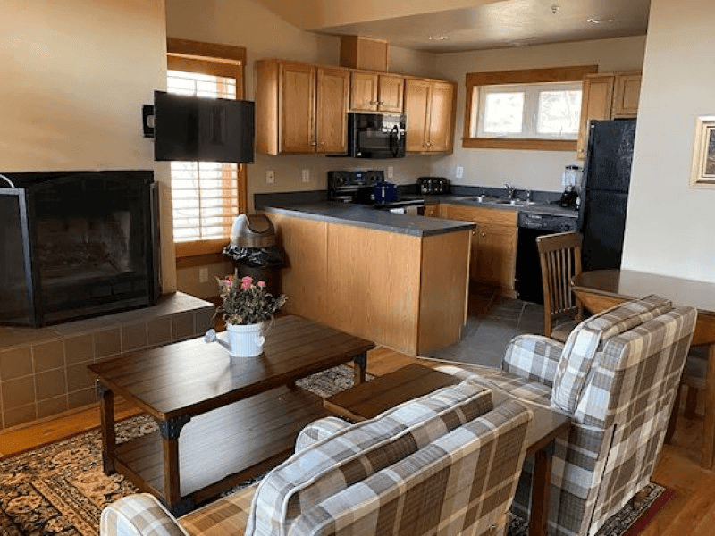 Relax in our spacious two-bedroom cabin, featuring vaulted ceilings, a wood-burning fireplace, and beautiful views.