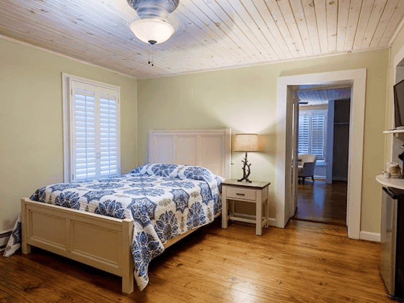 Another living space with a wraparound front porch can accommodate four guests. The cottage contains a natural gas fireplace, a king-size bed, and a sleeper sofa. Also, you have great lawn views from the wraparound porch.