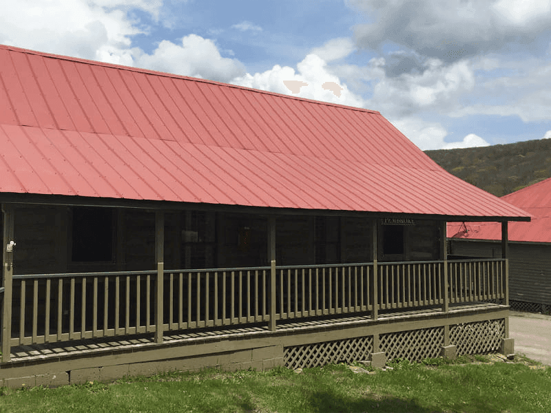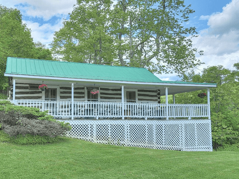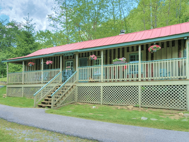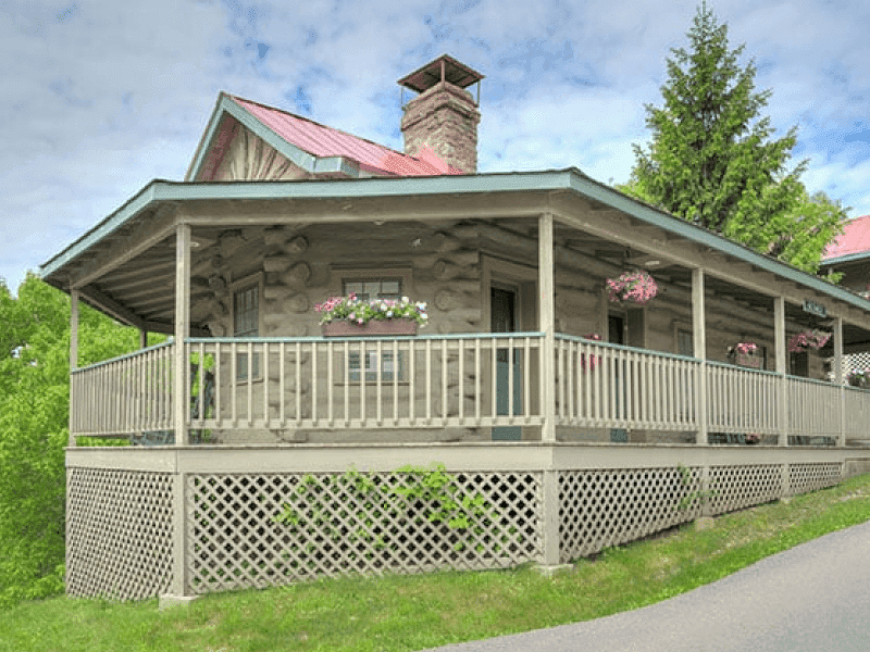 It is a two-bedroom cabin with two twin beds and one queen-size bed. The porch is wrapped around the cabin, and it is perched atop the historic cabin row. This cabin is less than five minutes walking distance from Main Stone Lodge.